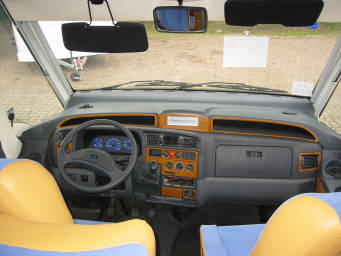 noch das Radio. Es ist in der Basis das typische Ducato Fahrerhaus, aber mit Wurzelholzverkleidung und einer aufgesetzten Applikation, um das orginal Armaturenbrett an das veränderte Fahrerhaus an zu passen. |