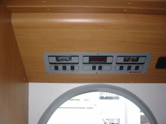 Hier lassen sich Wasserstände, Energievorrat sowie Innen- und Außentemperatur ablesen. Auch einzelne Stromkreise des Aufbaus lassen sich hier zentral schalten. |